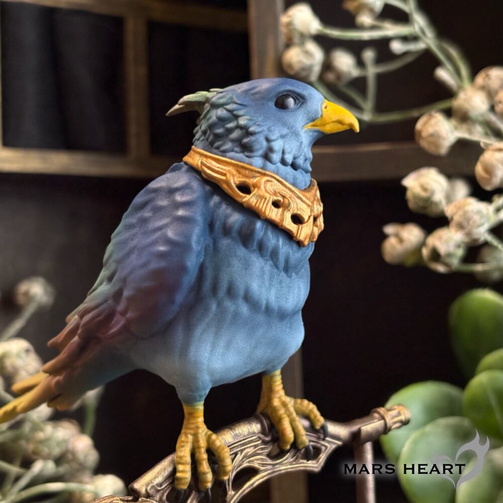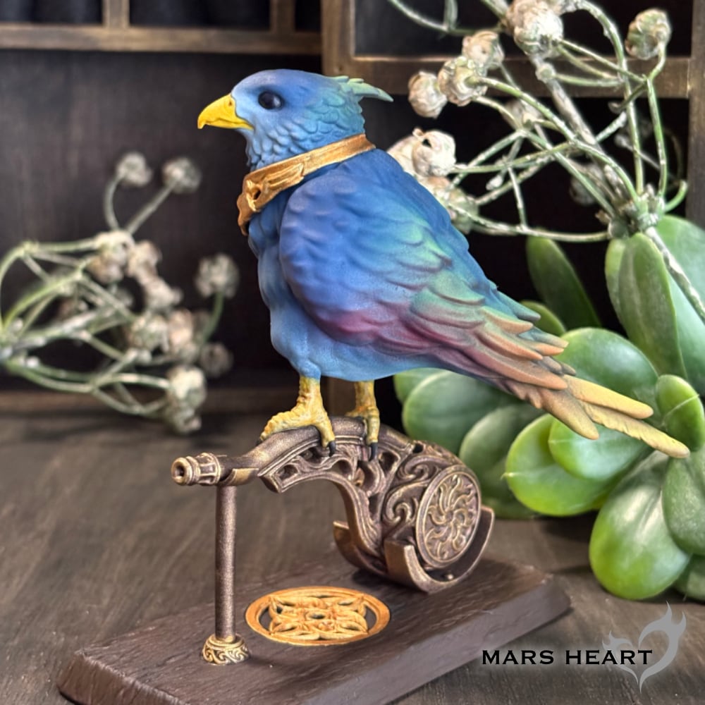 カラフルな外観と宝石のような目を持ち、空を飛ぶ姿は炎のように光をまとう。